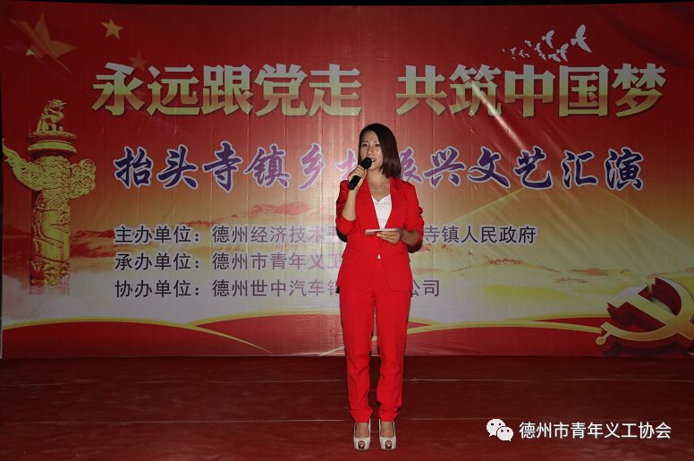 民族心,众志情,齐聚祖国共繁荣,时代变,祖国强,世纪新篇国运旺,为了进一步突出抬头寺镇社区两委班子党性强、作风正,探索出符合各自实际、各具特色的强村富民之路。切实把基层党组织的功能拓展到服务发展、服务社会、服务党员、服务群众上来。9月15日晚上,德州市青年义工协会在抬头寺镇张申社区开展“永远跟党走,共筑中国梦”乡村振兴文艺汇演。